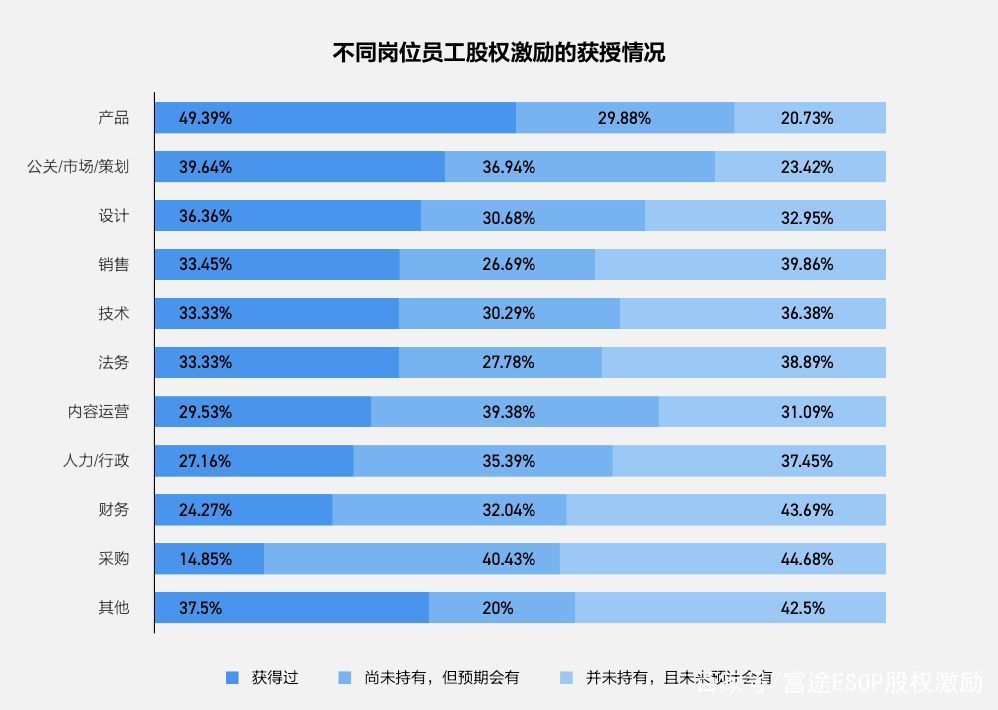 2. 各职能岗位中,产品经理获得股权激励的占比最高,采购部门被忽视 。从具体岗位分布来看,产品经理中,获得过股权激励的比例高达49.39%,位列第一。公关/市场/策划中,获得过股权激励的比例位列第二,达到39.64%。设计位列第三,占比36.36%。
