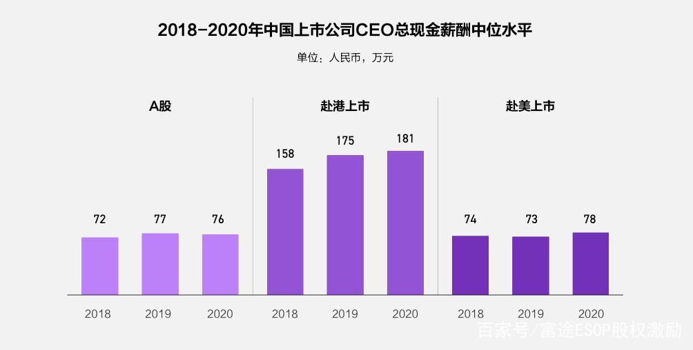 2020年,A股上市、赴港上市和赴美上市的中国公司CEO现金薪酬中位水平分别达到76万元、181万元和78万元。