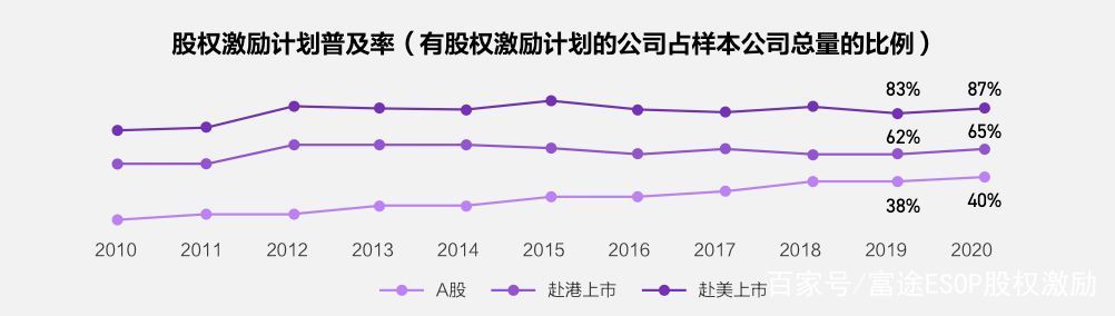三大资本市场股权激励计划普及率持续上升,总体增长态势保持平稳。2020财年,A股上市公司股权激励计划普及率较10年前翻了两番,从不足10%增长到40%;赴港及赴美上市公司股权激励计划普及率则分别达到65%与87%。
